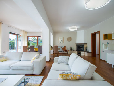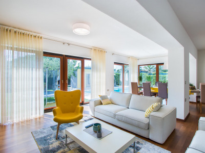 Komfortable Raumaufteilung in der Villa: grosses Wohnzimmer / Esszimmer / Küche – mit Fenstern und Zugang auf die grosse Terrasse mit Pool. Das Haus wird wie aktuell möbliert verkauft.