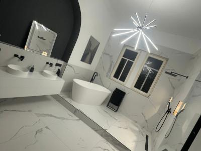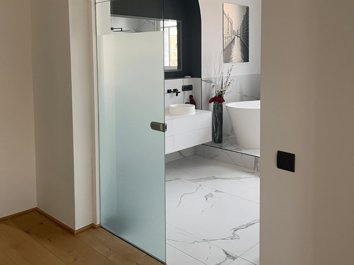 Luxuriöses Hauptbadezimmer mit stilvollen Materialien und großzügigem Raumgefühl